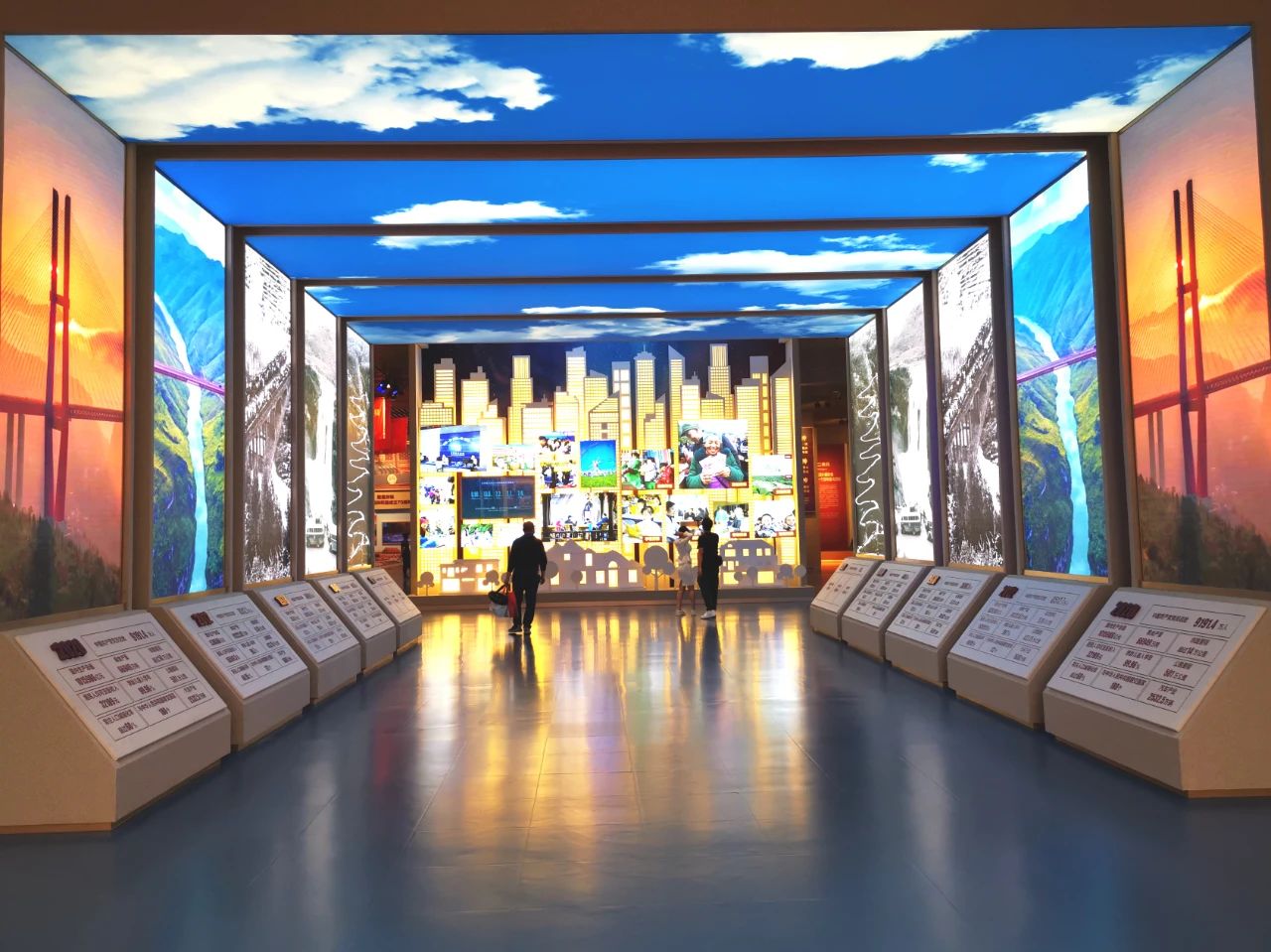 在百年長廊展示區(qū),左右對稱的超高清LED顯示屏,用圖片與視頻資料,展示了中國共產(chǎn)黨百年來帶領(lǐng)中國人民從貧困走向富強,從勝利走向新的勝利的輝煌歷程。