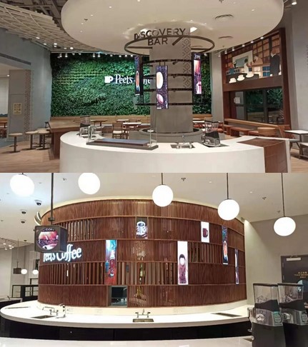 利亞德為皮爺咖啡量身打造不同規(guī)格的展示屏,在滿足功能的基礎(chǔ)上打造時(shí)尚優(yōu)雅的環(huán)境氛圍。