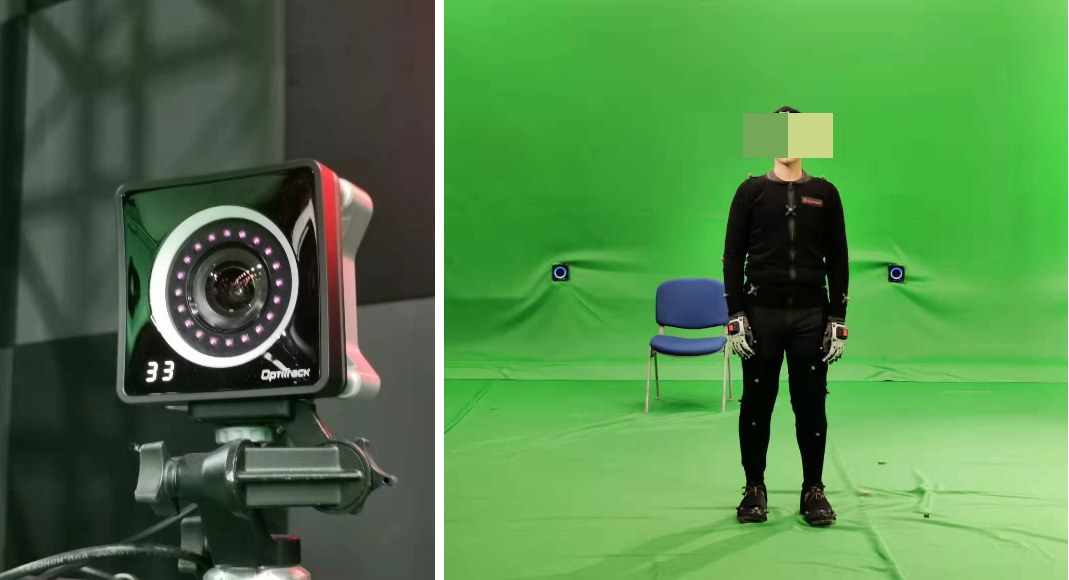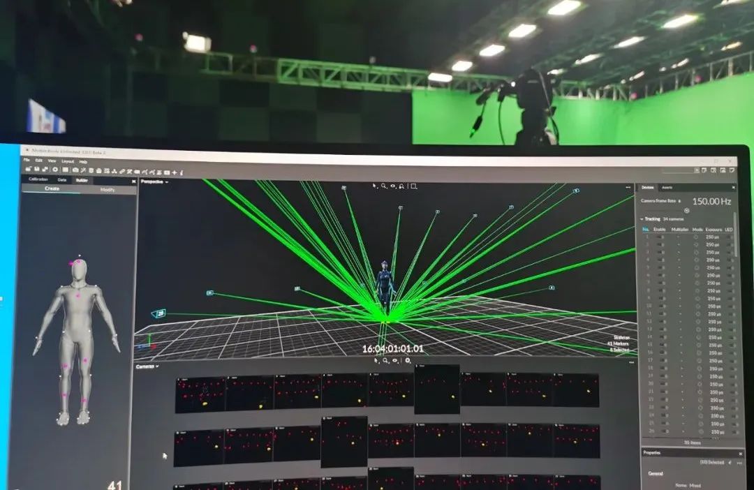 拍攝過程中,利亞德虛擬動點在現場架設了34臺Optitrack動捕攝像機,運用Motive3.0軟件對動捕演員的身體動作進行識別、分析,形成骨骼數據,并將骨骼數據流傳輸至Motionbuilder,實時驅動數字主持人“小漾”,為其注入活力,模擬完成主持人的工作。同時配合節目組進行與主持人間的對位,保障動捕系統與AR實時渲染端系統的正常對接、現場多系統間的時碼同步,確保節目順利進行。